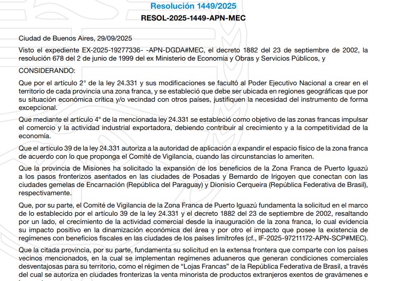 Según la Resolución 1449/2025 del ministro de Economía, Luis Caputo. Sería para industrias no contaminantes y turismo. Esta medida aprueba el nuevo Reglamento de Funcionamiento y Operación de la Zona Franca de la provincia, que entrará en vigor al día siguiente de su publicación.