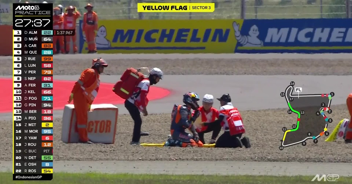 Un estremecedor accidente sacudió la segunda práctica de Moto3 que se llevó a cabo en Indonesia e involucró a Valentín Perrone, el compatriota que compite en dicha categoría.
