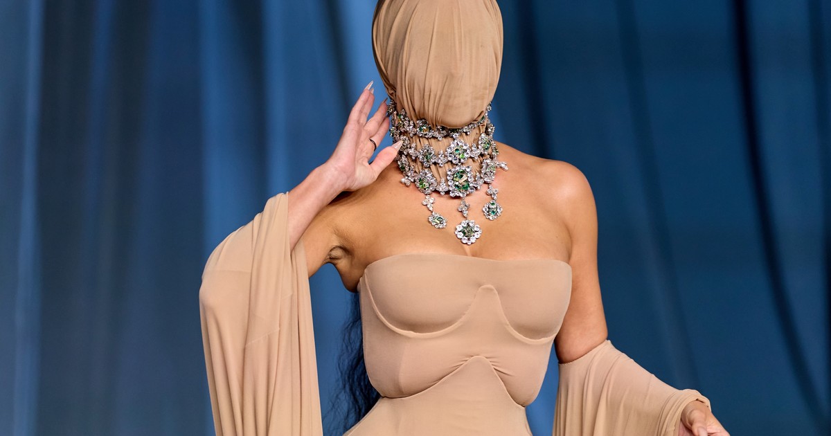 El vestido que usó Kim corresponde a la colección Couture Otoño 2025 de Maison Margiela, y consta de un diseño corset-strapless en tono nude, con mangas drapeadas que partían desde el codo y una silueta ceñida que luego se transformaba en una falda que fluía con ligero tren.