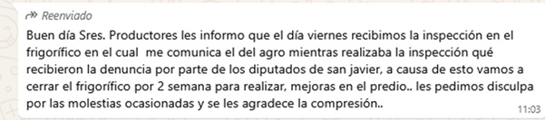 Según el mensaje difundido entre productores, durante la inspección un funcionario del Ministerio del Agro habría informado que la denuncia fue realizada por los legisladores sanjavierinos. “Recibimos la inspección en el frigorífico, y el inspector nos comunicó que la denuncia vino de parte de los diputados de San Javier. A causa de esto vamos a cerrar el frigorífico por dos semanas para realizar mejoras en el predio. Pedimos disculpas por las molestias ocasionadas y agradecemos la comprensión”, señala el comunicado difundido por los ganaderos.