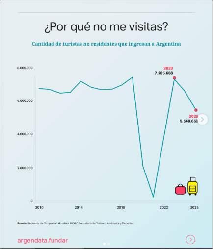 Los datos muestran que, en los últimos años, otros países no solo recuperaron sino que ampliaron de forma significativa sus exportaciones turísticas, superando ampliamente los niveles argentinos. En paralelo, la cantidad de turistas no residentes que ingresan al país presenta fuertes oscilaciones, con una caída abrupta tras el pico previo y una recuperación posterior que no alcanza los valores históricos más altos.