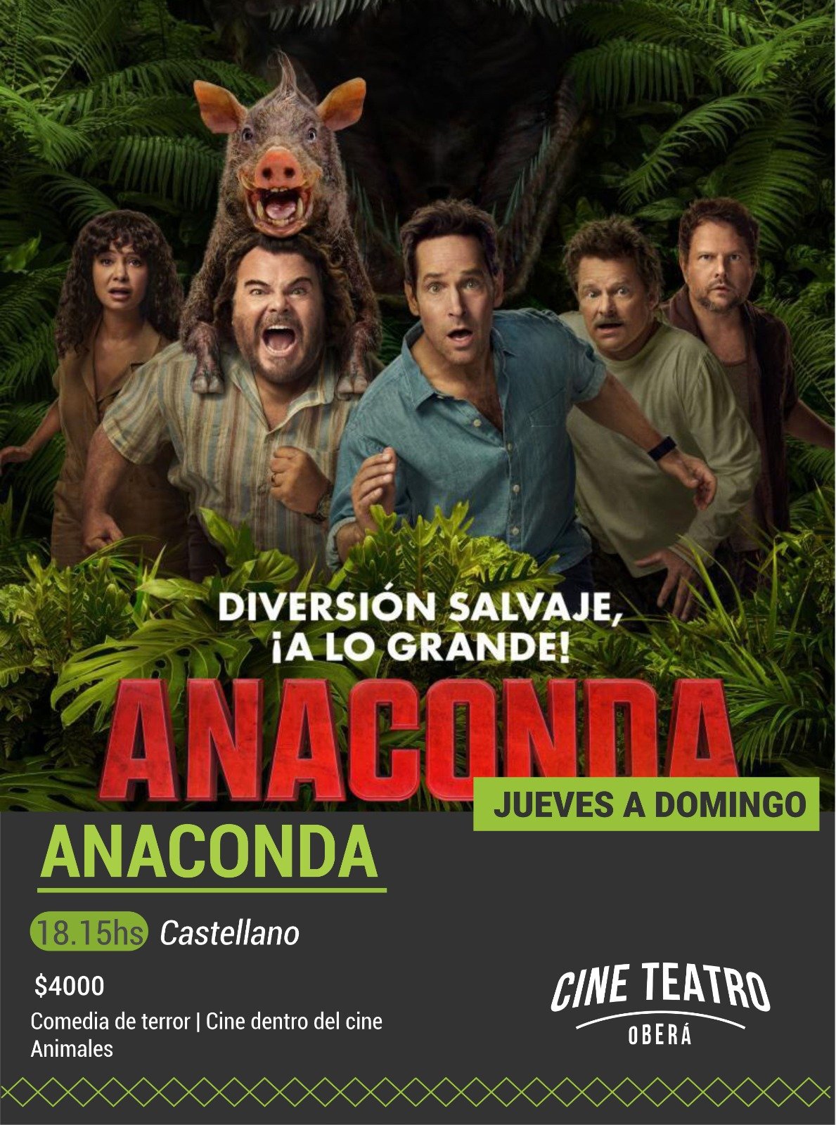 Para el público infantil y familiar se presenta “Tom y Jerry: La Brújula Mágica”, una aventura animada ambientada en la Antigua China, con funciones por la tarde y clasificación ATP. En el mismo tramo horario, pero con un tono muy diferente, se suma “Anaconda”, una comedia de terror que mezcla cine dentro del cine y acción en plena selva amazónica, apta para mayores de 12 años acompañados.