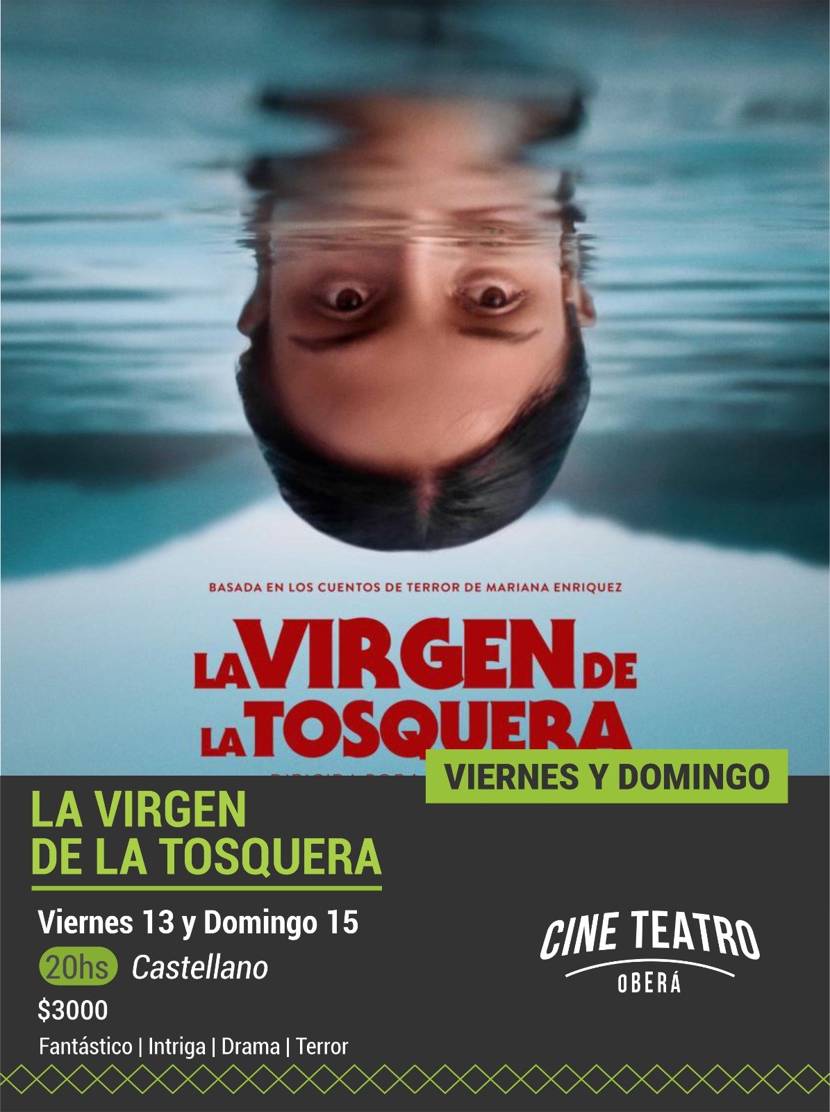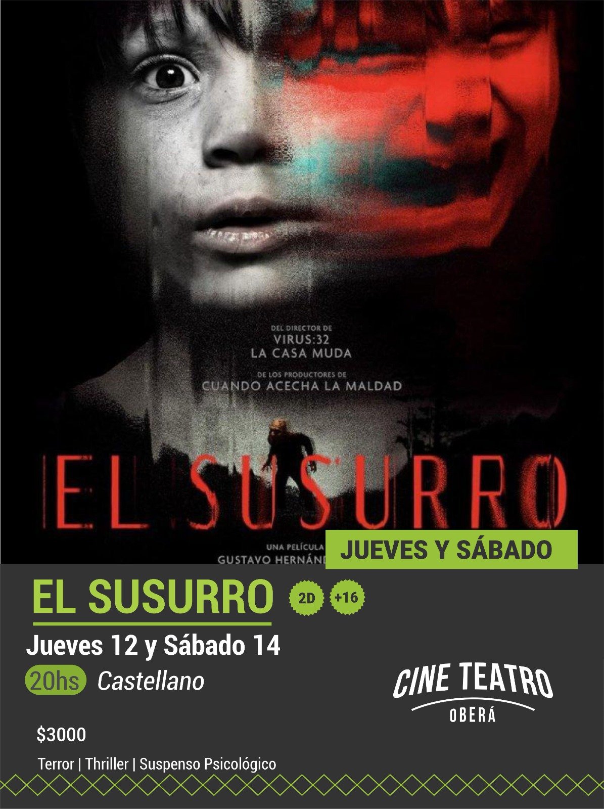 Las noches llegan con propuestas más intensas. “El Susurro”, de terror psicológico, se proyectará el jueves y sábado, mientras que “La Virgen de la Tosquera”, una producción nacional que cruza drama, intriga y elementos sobrenaturales, tendrá funciones el viernes y domingo. Ambas están recomendadas para mayores de 16 años.