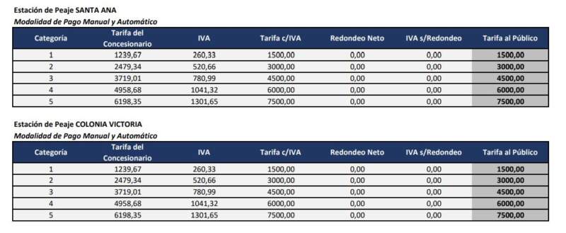 Las estaciones de peaje ubicadas en Santa Ana y Colonia Victoria, sobre la Ruta Nacional 12 en Misiones, aplicaron un nuevo incremento en sus tarifas. El nuevo cuadro tarifario comenzará a regir a partir de las 0 del jueves 26 de febrero.