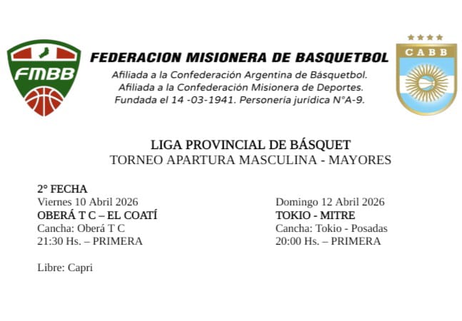 La Federación Misionera de Básquet dio a conocer el fixture de una nueva jornada del torneo Apertura de la Liga Provincial Masculina. El clásico posadeño se perfila como el encuentro que se llevará todas las luces. También habrá juego en Oberá. ¿Cuándo? Acá te lo contamos.