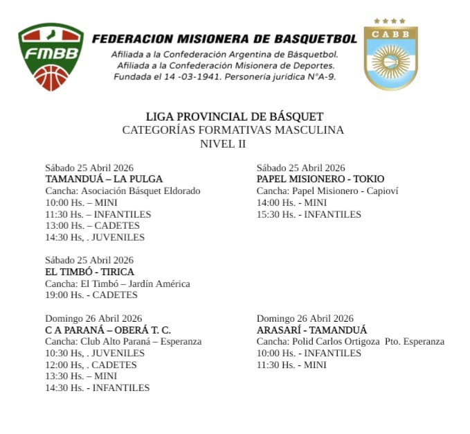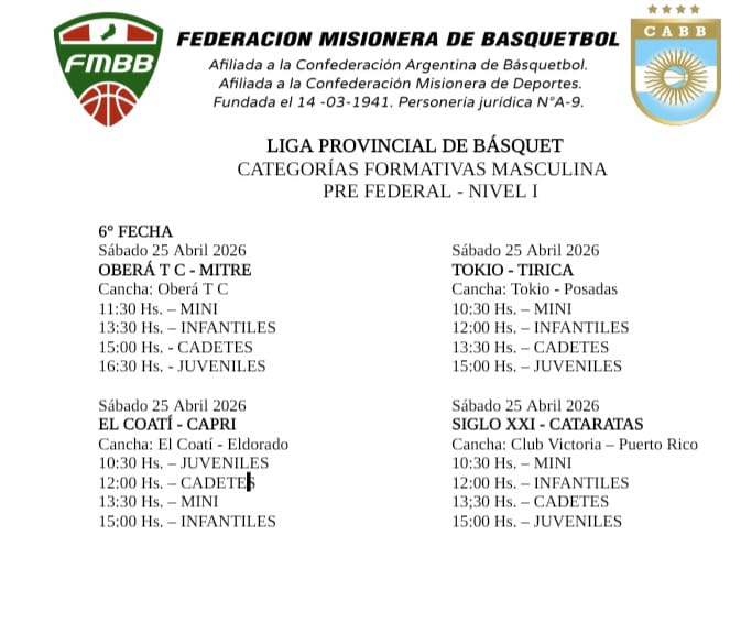 La 6ª fecha de la Liga Provincial de Básquet en categorías formativas masculinas se disputará este sábado y domingo en distintos puntos de Misiones, con la participación de clubes de toda la provincia. El certamen, organizado por la Federación Misionera de Básquetbol, incluye encuentros en Nivel I (Pre Federal) y Nivel II, abarcando las divisiones Mini, Infantiles, Cadetes y Juveniles, con el objetivo de sostener la competencia y el desarrollo deportivo en etapas formativas.