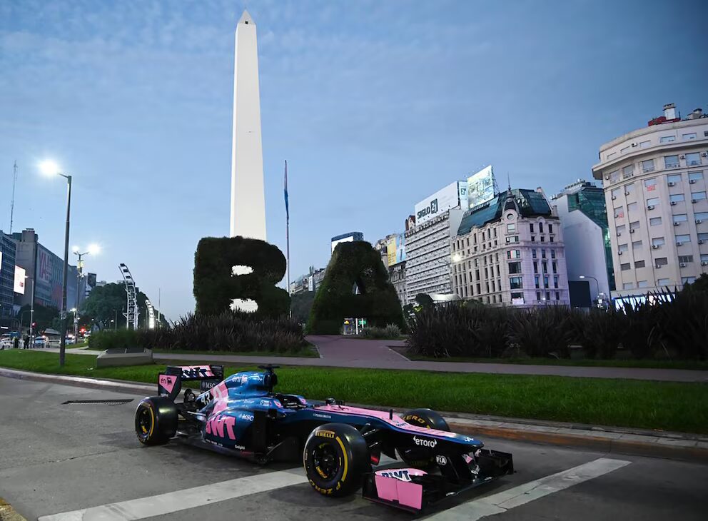 Un día antes del road show, el monoplaza con el que el piloto de Alpine dará sus primeras tres vueltas al circuito callejero de Palermo apareció en el centro de Buenos Aires para anticipar la jornada.